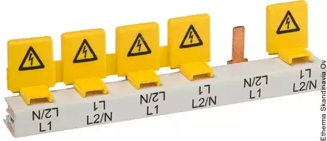 Piikki sekä haarukka virtakiskoille keltainen kosketussuoja.