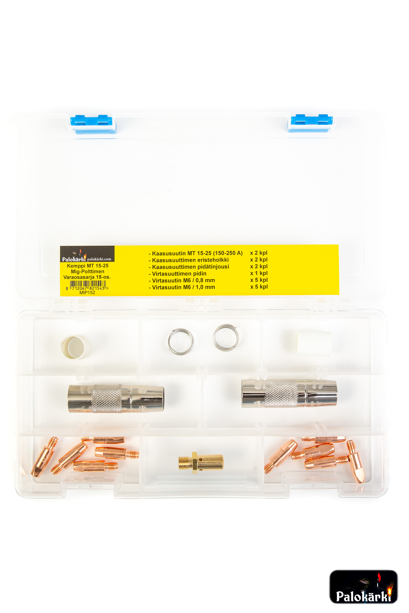 Kemppi MT15 - MT25 Mig-polttimen varaosasarja 18-os. Sisältö: - Kaasusuutin MT 15-25 (150-250A) x 2 kpl - Kaasusuuttimen eristysholkki x 2 kpl - Kaasusuuttimen pidätinjousi x 2 kpl - Virtasuuttimen... Lue lisää