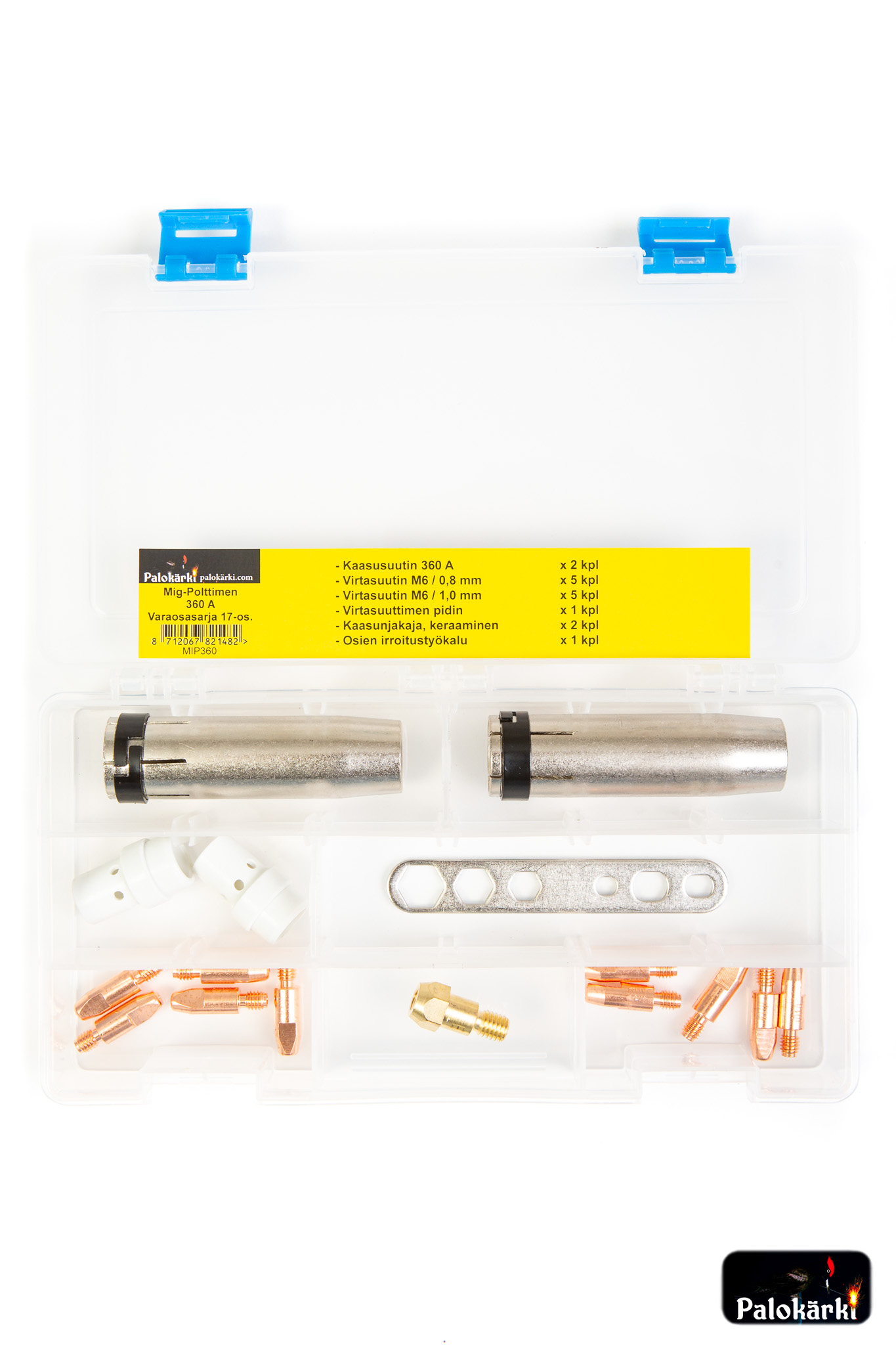 Mig-Polttimen 360 A Varaosasarja 17 -osaa Kaasusuutin 360 A x 2 kpl Virtasuutin M6/0,8 mm x 5 kpl Virtasuutin M6/1,0 mm x 5 kpl Virtasuuttimen pidin x 1 kpl Kaasujakaja, keraaminen x 2 kpl Osien... Lue lisää