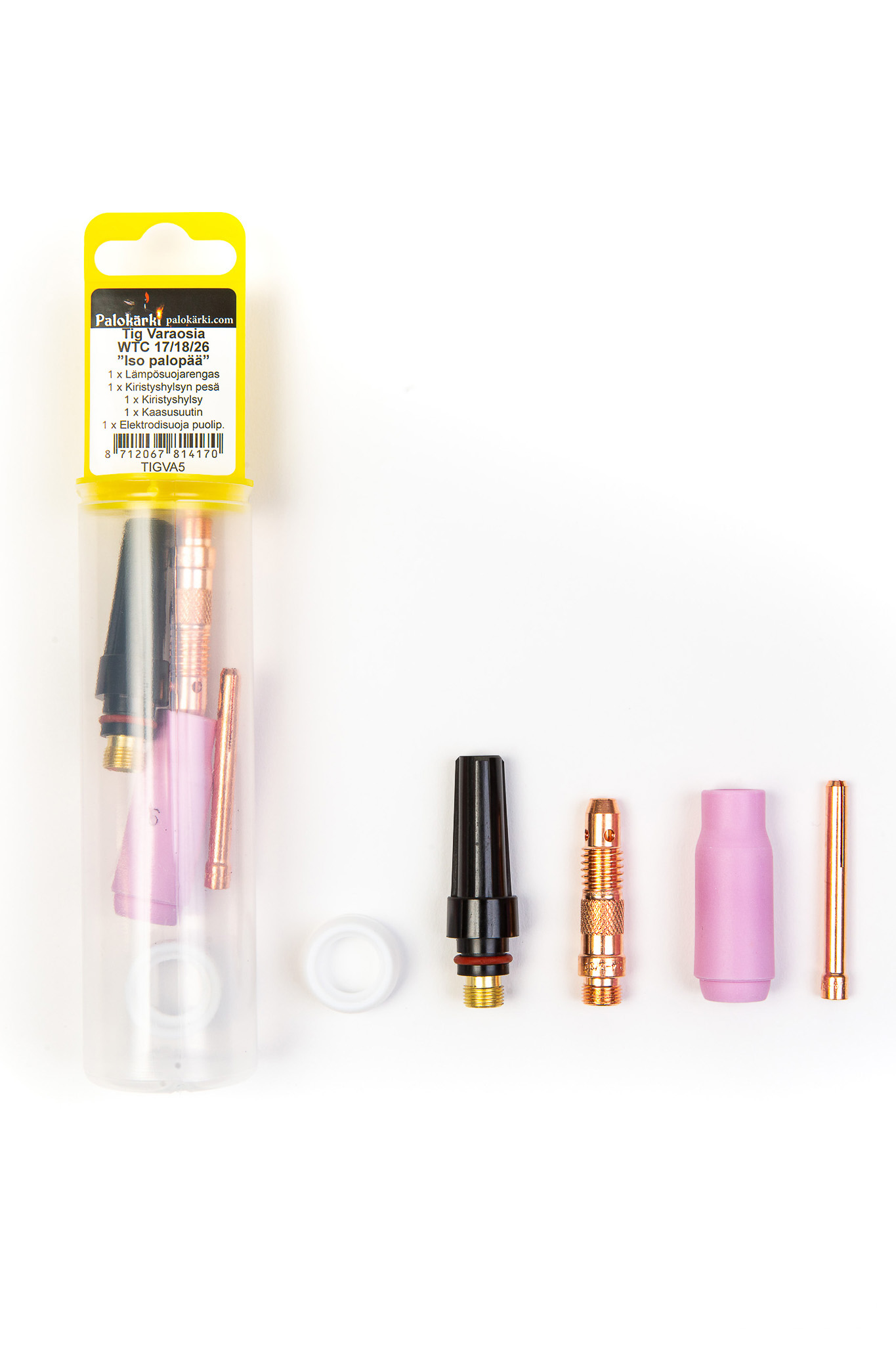 WTC 17/18/26 Iso palopää - 1 x Lämpösuojarengas - 1 x Kiristyshylsyn pesä - 1 x Kiristyshylsy - 1 x Kaasusuutin - 1 x Elektrodisuoja puolip.