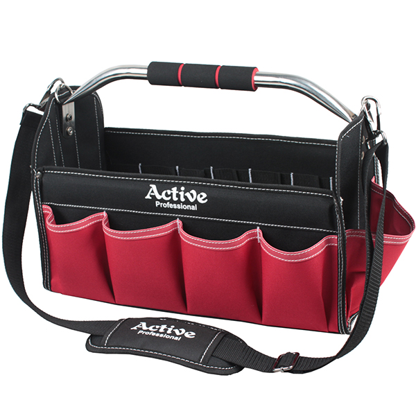 Avoin työkalulaukku, jossa 11 taskua ulkopuolella ja 7 sisäpuolella. Olkahihna, jossa olkapäällä pehmuste. Kestää maksimissaan 15 kg painon. Kantokahvassa keskiosan pehmuste. Materiaali polyesteri.