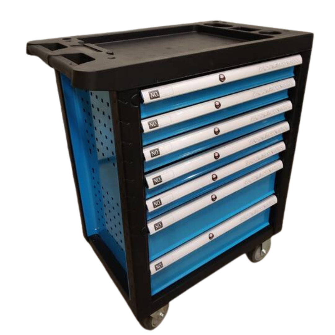 Laadukas ja tyylikäs tyhjä työkaluvaunu lukittavalla 7 kuulalaakeroidulla laatikolla.