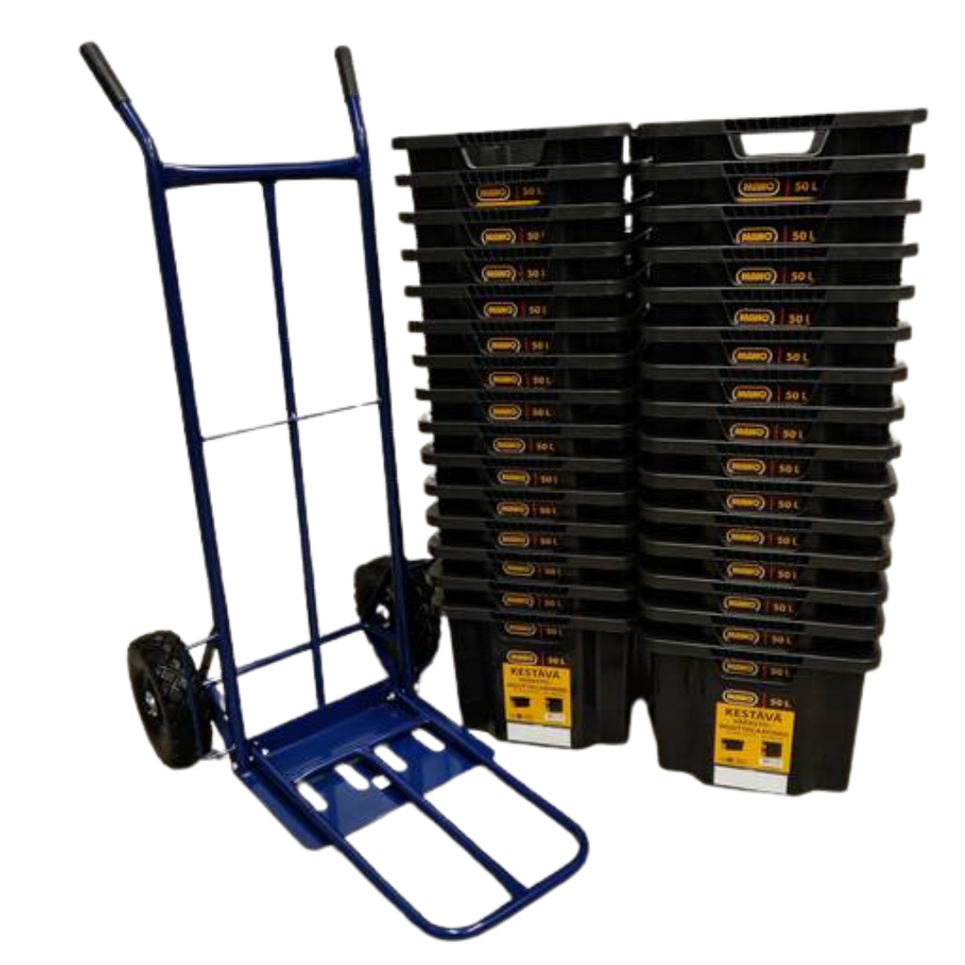 Muuttajan sarja sisältää nokkakärryt jatkonokalla ja umpikumipyörillä, ja 50L varastolaatikot 30kpl.