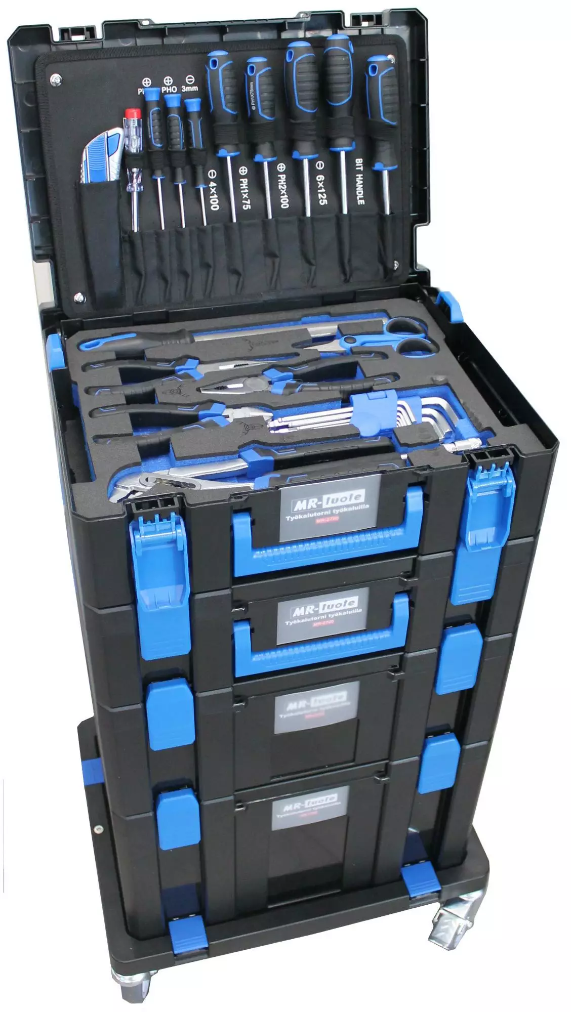 Koostuu erillisistä, yhteen liitettävistä työkalupakeista (4 kpl) ja pyörillä olevasta siirtoalustasta. Pakit - L 402 x S 302 x K 126 mm x 2 kpl - L 402 x S 302 x K 166 mm x 1 kpl - L 402 x S... Lue lisää