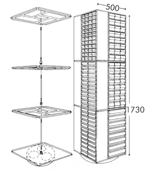 - Mitat laatikostojen kanssa koottuna 500 x 500 x 1730 mm