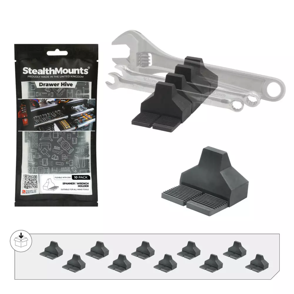 StealthMounts Drawer Hive kiintolenkkiavainpidikkeet auttavat pitämään työkalupakkisi järjestyksessä ja lenkkiavaimet sekä muut käsityökalut helposti käden ulottuvilla. Valmistettu Isossa-Britanniassa erittäin kestävästä ruiskuvaletusta TPE-materiaalista, joka on joustava ja pitävä materiaali, joka varmistaa, että työkalusi eivät liiku metallisessa työkalupakassasi tai työkaluvaunussasi.