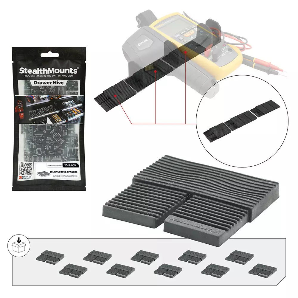 StealthMounts Drawer Hive välikappaleiden avulla pidennät työkalujen välejä menettämättä Drawe Hive tiukkaa kiinnitystä. Valmistettu Isossa-Britanniassa erittäin kestävästä ruiskuvaletusta TPE-materiaalista, joka on joustava ja pitävä materiaali, joka varmistaa, että työkalusi eivät liiku metallisessa työkalupakassasi tai työkaluvaunussasi.